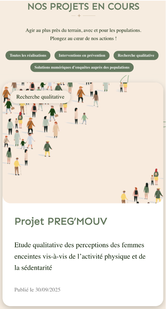 • Notre association est experte dans le recueil et l’analyse de données des perceptions de populations « cibles » via une approche par les déterminants de la santé avec une entrée mixte (qualitatif et quantitatif).