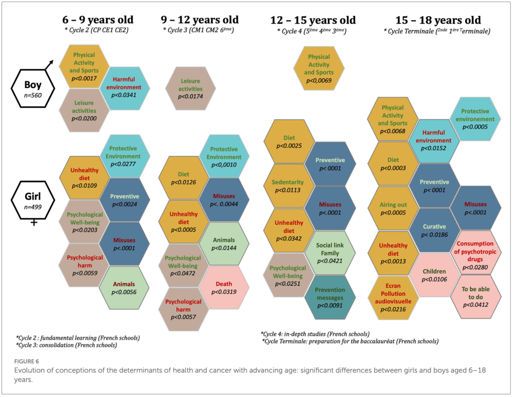 Cette figure présente l’évolution des conceptions des déterminants de la santé et du cancer avec l’avancée en âge :   Différences significatives entre les filles et les garçons de 6 à 18 ans.